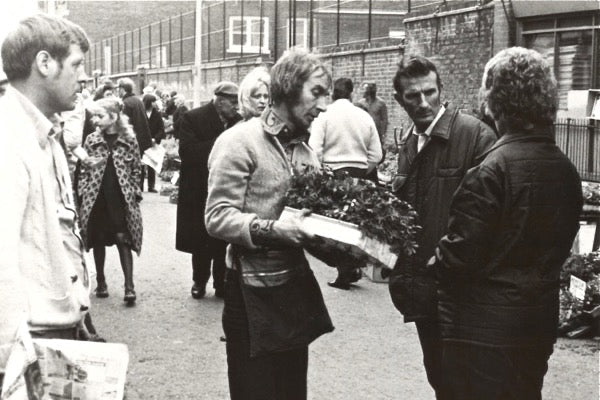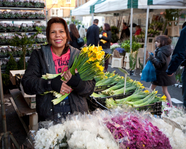Lisa runs the cut flower stall on the one of the long-established Burridge family pitches for her husband Pete, while he manages the nursery in Hoddeston with his brother dealing in plants that are sold on another pitch. “It used to be forty stalls out of fifty-two here were Burridges once upon a time, Herbie told me,” commented Lisa in wonder. “More like twenty-one out of fifty-two,” qualified Pete with a good natured shrug, making a more conservative estimate as he arrived to join the conversation – though still quite an extraordinary proportion for one family in a market. “The old man liked to tell a tale,” admitted Lisa to me, flashing an indulgent smile, before she turned back to serve the next customer, reaching for yet another handful of the scented Spring flowers that surrounded her in a bower of pale yellow.